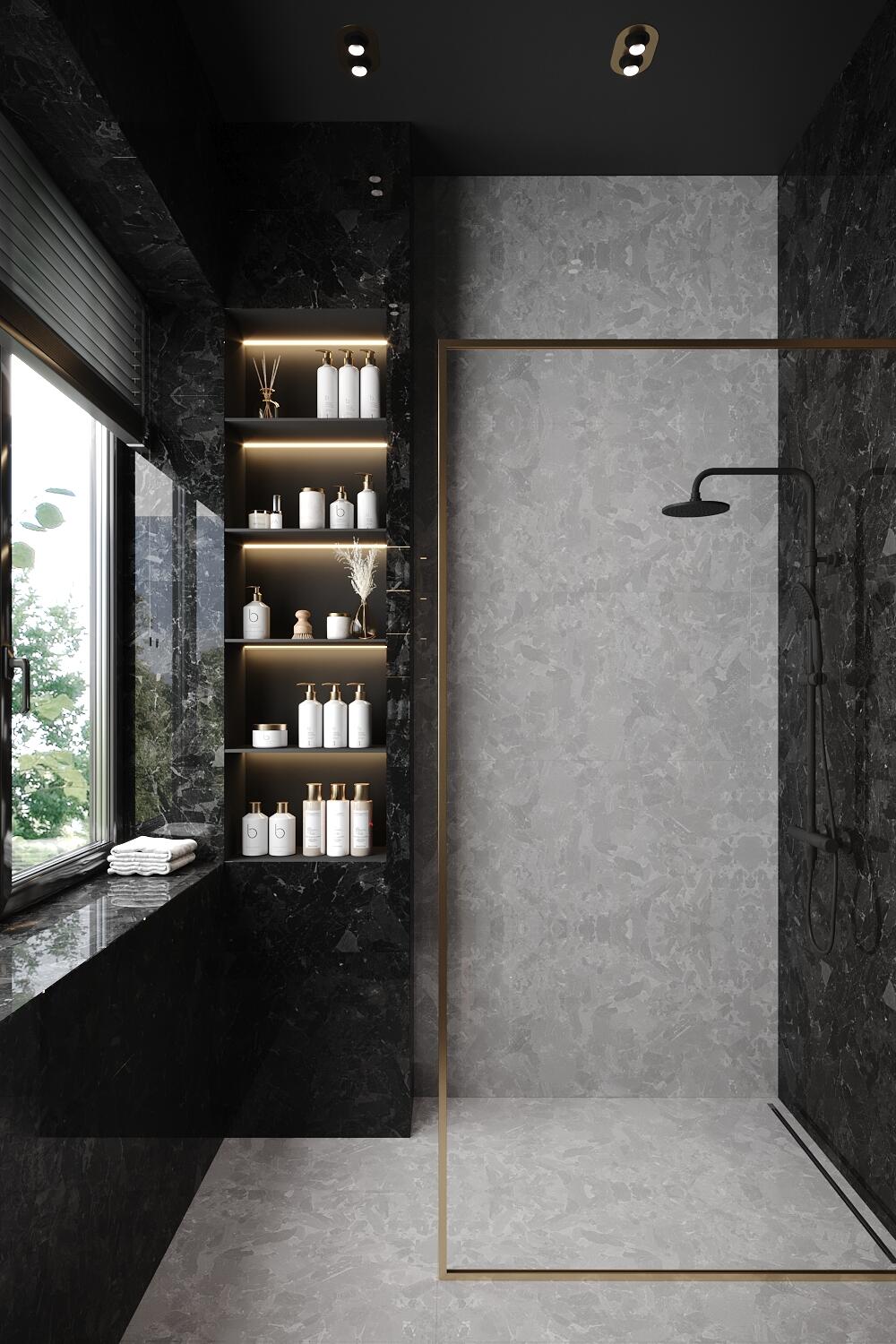 - Каменные фактуры — чёрный и серый мрамор, декоративный камень с активным рисунком — выступают как ключевые визуальные акценты. Они придают пространству динамику и подчёркивают премиальность.