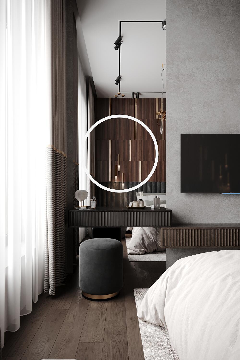 Большая кровать с объёмным изголовьем выполнена в тёмной бархатистой обивке, а текстиль, подобранный в серо-бежевой палитре, подчёркивает атмосферу уюта. Основной акцент освещения — изящная люстра, напоминающая ветви с каплями росы, добавляет нотку арт-объекта. Пространство дополняет минималистичная ТВ-зона с подвесной тумбой и трюмо у окна с круглым зеркалом и мягким пуфом.