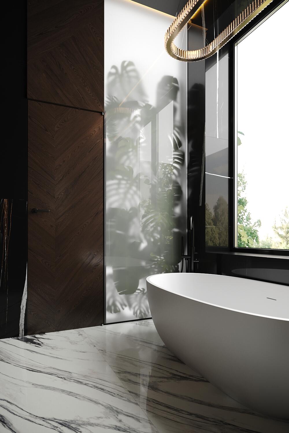 За матовым стеклом мастер-ванной размещено декоративное панно с изображением папоротников. Этот приём стал тонкой отсылкой к природным мотивам и гармонично разбавил насыщенную тёмную палитру помещения. Светлый мраморный пол и отдельно стоящая ванна получили выразительную поддержку, а пространство — индивидуальный акцент, который отличает его от типовых решений.