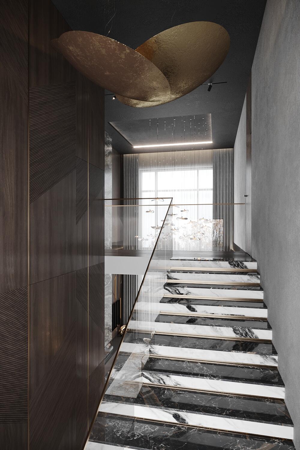 Основной акцент — на фактурах и свете. Шпон ореха, мрамор, латунь, декоративная штукатурка, натуральный камень и мягкие текстуры мебели создают живую, тактильную среду. Освещение выстроено в сценариях, подчеркивая объёмы и создавая нужную атмосферу — от вечернего уюта до яркого дневного света.